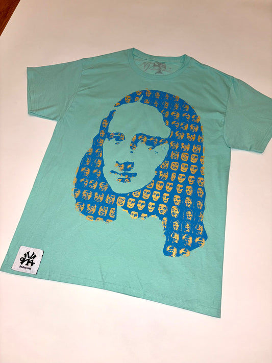 SIZE M : MONA LISA GOLD LEAF PRINT ; LIGHT BLUE WITH GOLD ON TEAL